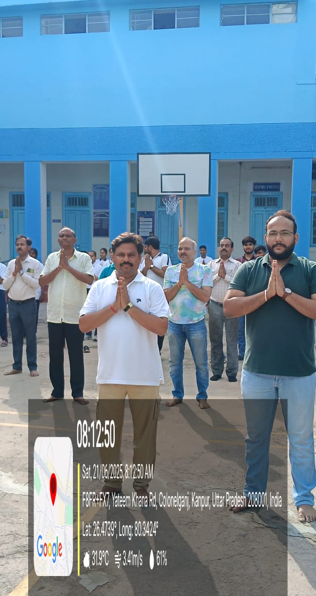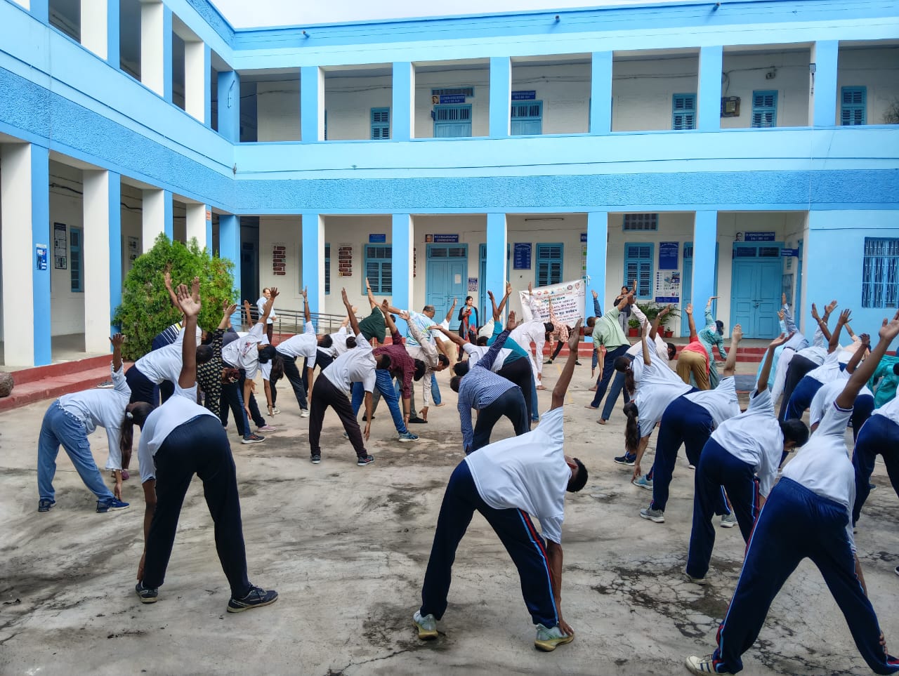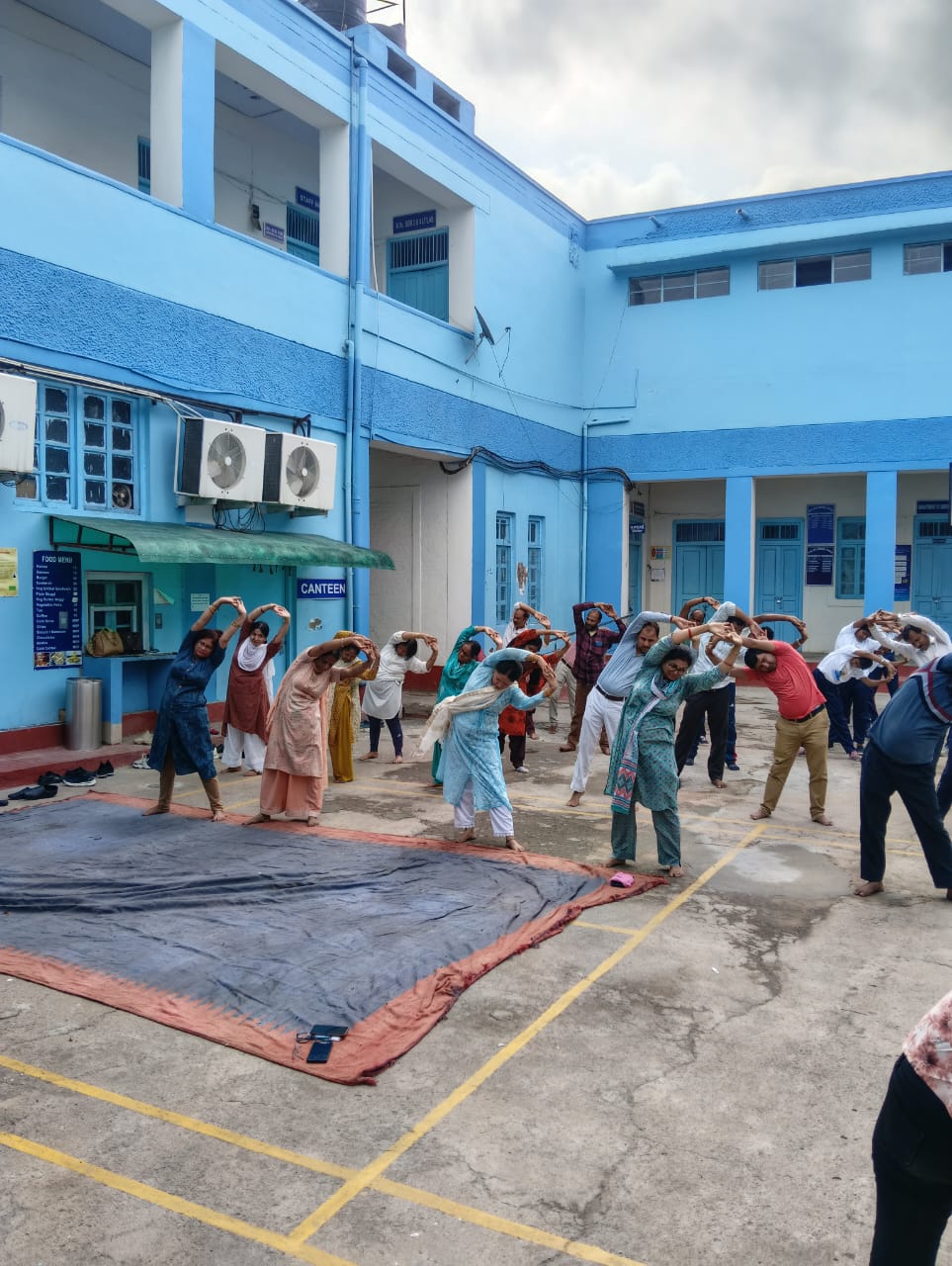 योगा प्रशिक्षक मानसी शर्मा ने शिक्षकों एवं सभी छात्र-छात्राओं को सूर्य नमस्कार और योग के विभिन्न आसन सिखाये।