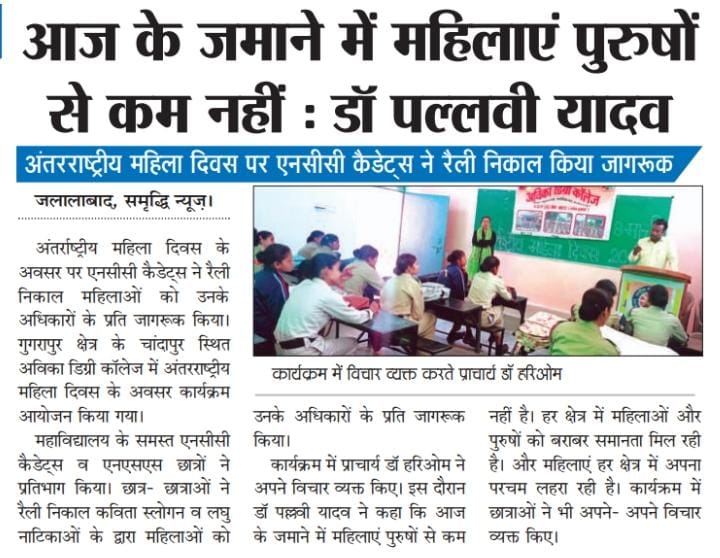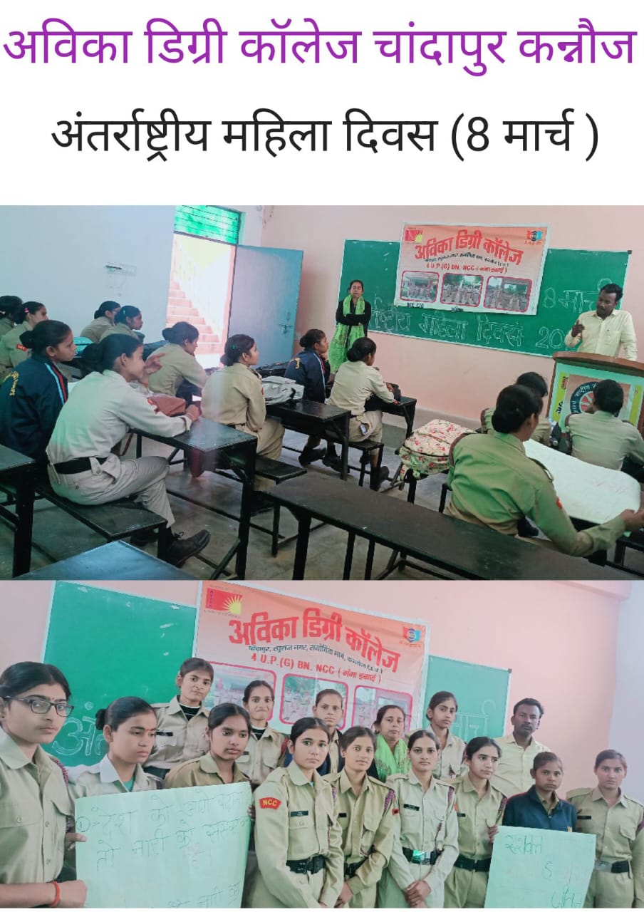 गुगरापुर क्षेत्र के चांदापुर स्थित अविका डिग्री कॉलेज में अंतरराष्ट्रीय महिला दिवस के अवसर कार्यक्रम आयोजन किया गया। महाविद्यालय के समस्त एनसीसी कैडेट्स व एनएसएस छात्रों ने प्रतिभाग किया। छात्र- छात्राओं ने रैली निकाल कविता स्लोगन व लघु नाटिकाओं के द्वारा महिलाओं को उनके अधिकारों के प्रति जागरूक किया।कार्यक्रम में प्राचार्य डॉ हरिओम ने अपने विचार व्यक्त किए। इस दौरान डॉ पल्लवी यादव ने कहा कि आज के जमाने में महिलाएं पुरुषों से कम नहीं है। हर क्षेत्र में महिलाओं और पुरुषों को बराबर समानता मिल रही है। और महिलाएं हर क्षेत्र में अपना परचम लहरा रही है। कार्यक्रम में छात्राओं ने भी अपने- अपने विचार व्यक्त किए।