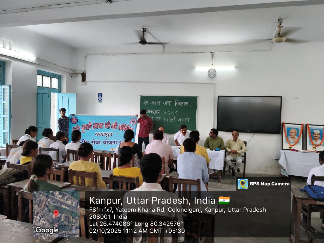 पंडित पृथी नाथ (पी.जी.) महाविद्यालय, कानपुर में गांधी एवं शास्त्री जयंती अवसर पर एन.एस.एस. व एन.सी.सी. इकाइयों द्वारा संयुक्त कार्यक्रम आयोजित हुआ। कार्यक्रम में एन.एस.एस. कार्यक्रम अधिकारी श्री कुँवर महेंद्र प्रताप सिंह, एन.सी.सी. कार्यक्रम अधिकारी डॉ. दिनेश यादव, अर्थशास्त्र विभाग की डॉ. अल्का अस्थाना एवं प्राचार्य महोदय की उपस्थिति रही।