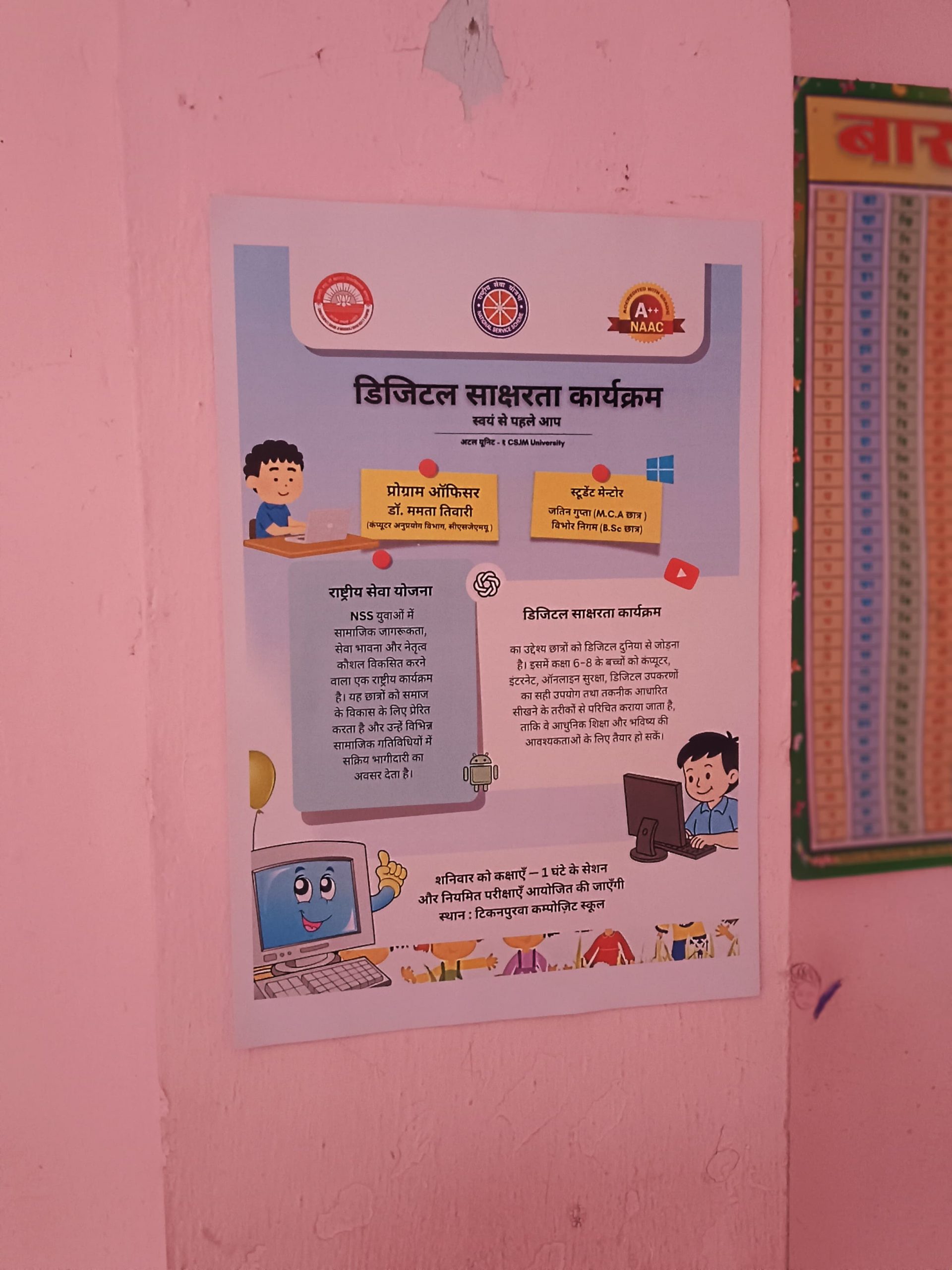 दिनांक: 15 दिसम्बर 2025स्थान: टीकनपुरवा कॉम्पोजिट स्कूल, बिठूर (मंधन)एनएसएस “Atal Unit 1” द्वारा टीकनपुरवा कॉम्पोजिट स्कूल में संचालित डिजिटल जागरूकता कार्यक्रम के अंतर्गत आज विद्यार्थियों को प्रथम यूनिट टेस्ट का परिणाम घोषित किया गया।