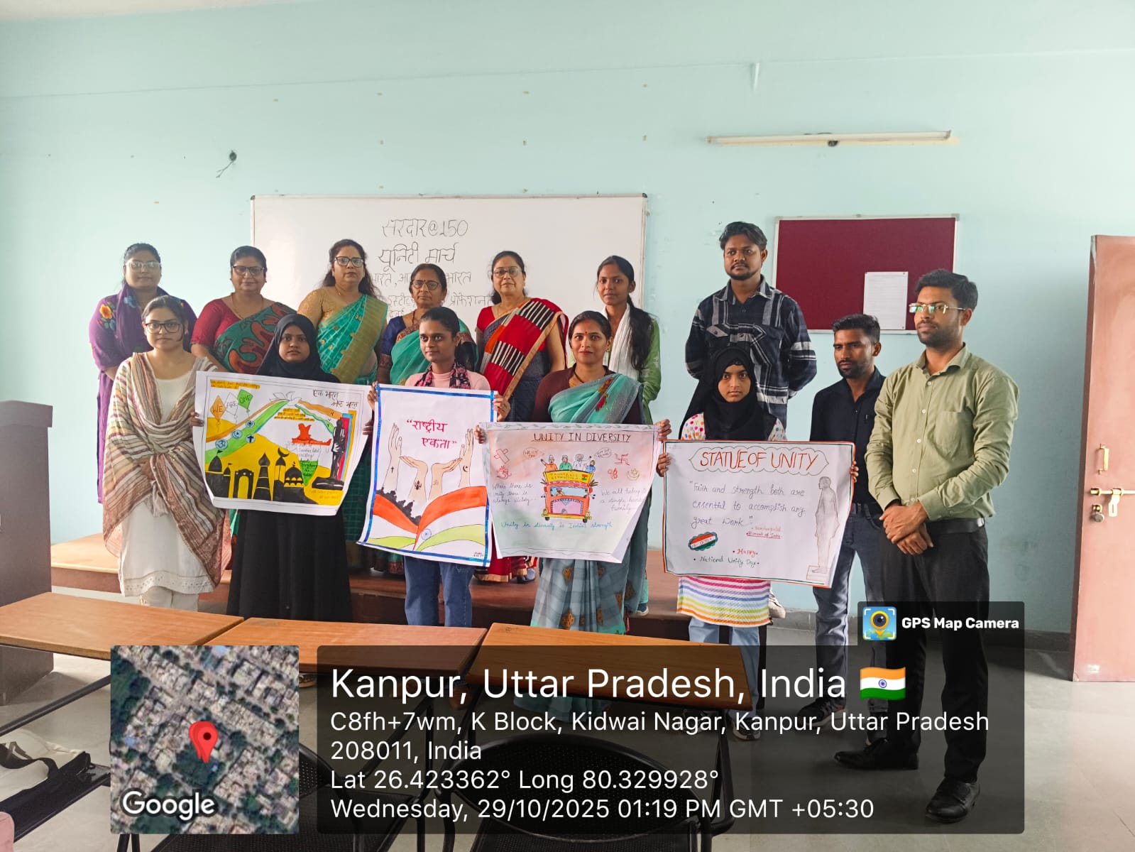 डॉ. वीरेंद्र स्वरूप इंस्टिट्यूट ऑफ प्रोफेशनल स्टडीज़ किदवई नगर की राष्ट्रीय सेवा योजना इकाई द्वारा दिनांक 29 अक्टूबर 2025 को सरदार वल्लभभाई पटेल की 150वीं जयंती के उपलक्ष्य में एक चार्ट प्रतियोगिता (Chart Competition) का आयोजन किया गया। यह कार्यक्रम प्री इवेंट के रूप में आयोजित किया गया था, जिसका उद्देश्य विद्यार्थियों में राष्ट्रीय एकता, संगठन, एवं लौह पुरुष सरदार पटेल के योगदान के प्रति जागरूकता फैलाना था।कार्यक्रम का शुभारंभ संस्थान की प्राचार्या डॉ. पूनम मदान जी द्वारा किया इसके पश्चात् एनएसएस प्रभारी डॉ सीमा मिश्रा ने छात्राओं को कार्यक्रम के उद्देश्य एवं सरदार पटेल के जीवन से संबंधित प्रेरणादायक प्रसंगों से अवगत कराया।प्रतियोगिता में विभिन्न छात्राओं ने उत्साहपूर्वक भाग लिया। प्रतिभागियों ने अपने चार्टों के माध्यम से राष्ट्रीय एकता, अखंडता, नेतृत्व, और स्वतंत्रता संग्राम में सरदार पटेल की भूमिका को रचनात्मक रूप से प्रस्तुत किया। सभी प्रतिभागियों के कार्यों में देशभक्ति की भावना और सृजनात्मकता झलक रही थी।