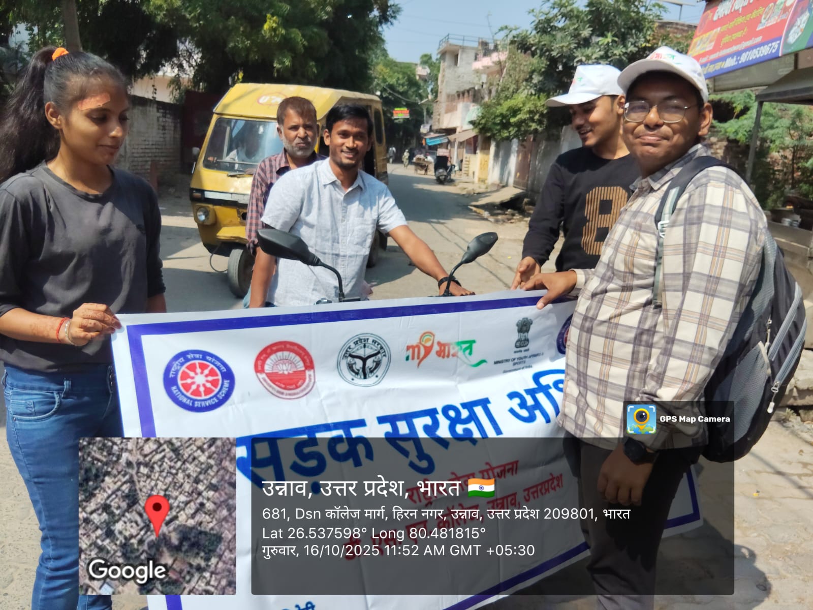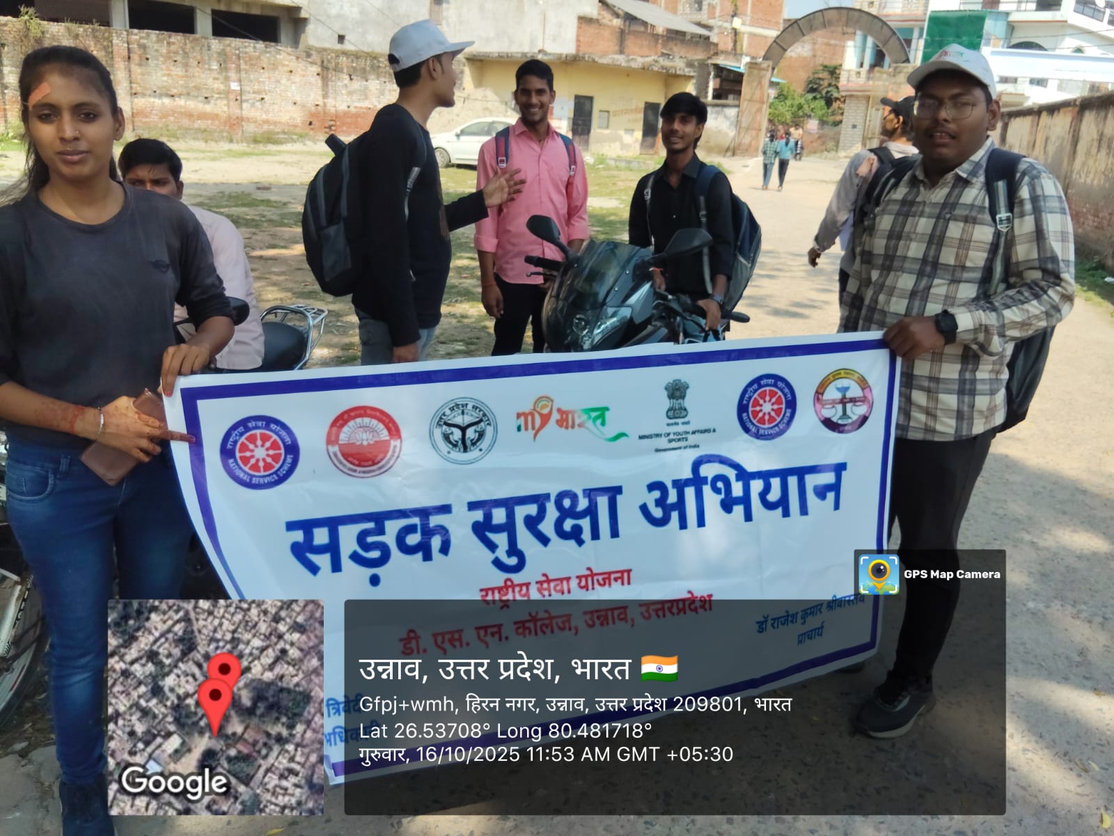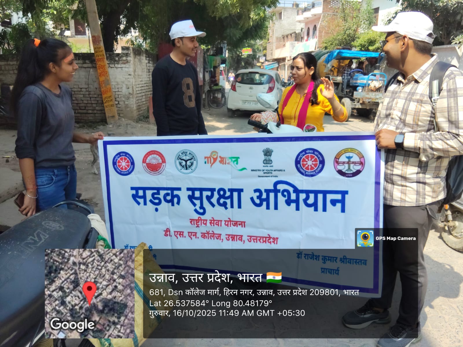 डी एस एन कॉलेज उन्नाव के 10 स्वयंसेवकों की टोली ने महाविद्यालय परिसर से लेकर छोटा चौराहा उन्नाव तक मार्ग में जाकर बिना हेलमेट लगाए,ज्यादा सवारियां बिठाए और उल्टे साइड से आ रहे लोगों को बताया कि यह उनके लिए कितना नुकसान देह है साथ ही उनसे निवेदन किया कि वह सड़क के नियमों का पालन स्वयं की सुरक्षा के लिए और अन्य लोगों की सुरक्षा के लिए आवश्यक करें।