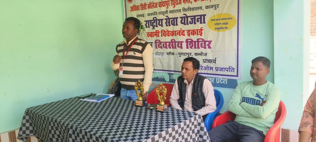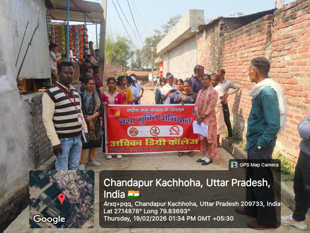 उन्होंने बताया कि अत्यधिक मोबाइल उपयोग, नशे की आदत या किसी भी वस्तु का अत्यधिक प्रयोग व्यक्ति और समाज दोनों के लिए हानिकारक है। नशा व्यक्ति की सोचने-समझने की क्षमता को प्रभावित करता है, जिससे वह अपने मताधिकार जैसे महत्वपूर्ण अधिकार का सही उपयोग नहीं कर पाता। अंत में उन्होंने सभी अतिथियों का धन्यवाद ज्ञापित करते हुए प्रथम सत्र का समापन किया। भोजनावकाश के पश्चात स्वयंसेवकों ने “ *एक वोट – एक देश* ” विषय पर *नुक्कड़ नाटक* का अभ्यास किया तथा ग्राम चाँदापुर में मतदाता जागरूकता रैली निकालकर ग्रामीणों के मध्य नुक्कड़ नाटक प्रस्तुत किया। इसके माध्यम से ग्रामीणों को मतदान के महत्व एवं लोकतंत्र में उनकी भूमिका के प्रति जागरूक किया गया। इसके बाद स्वयंसेवकों ने नशा मुक्ति रैली निकालकर जनसामान्य को नशे के दुष्परिणामों से अवगत कराया।सायंकालीन सत्र में स्वयंसेवकों ने खेल-कूद गतिविधियों में उत्साहपूर्वक भाग लिया तथा अंताक्षरी के माध्यम से सांस्कृतिक सहभागिता प्रदर्शित की। तत्पश्चात सभी स्वयंसेवकों ने NSS शपथ ली और भोजन ग्रहण किया। इस अवसर पर महाविद्यालय के समस्त शिक्षकगणों का सराहनीय सहयोग प्राप्त हुआ ।