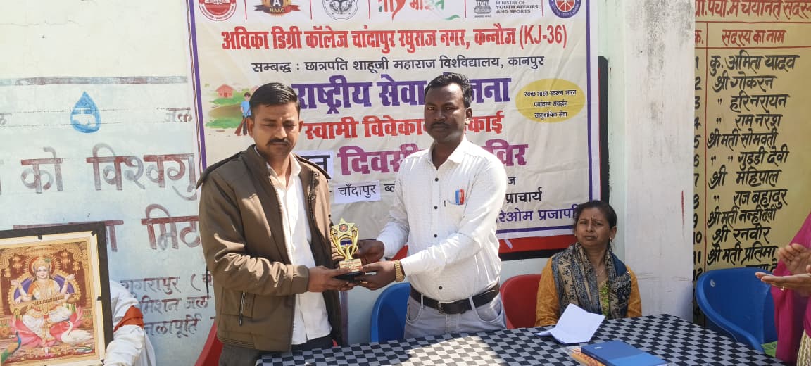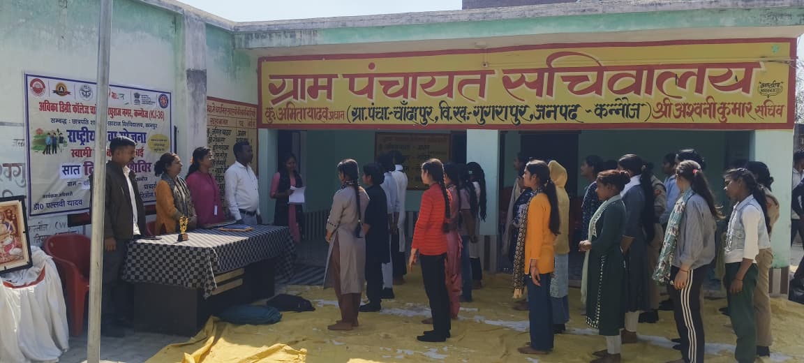 आज दिनांक 17 फरवरी 2026 को अविका डिग्री कॉलेज, कन्नौज की राष्ट्रीय सेवा योजना (NSS) इकाई द्वारा सात दिवसीय विशेष शिविर का शुभारंभ ग्राम पंचायत चाँदापुर में प्राचार्य डॉ. हरिओम प्रजापति के संरक्षण एवं कार्यक्रम अधिकारी डॉ. पल्लवी यादव के नेतृत्व में सफलतापूर्वक किया गया। प्रातःकाल सभी स्वयंसेवक महाविद्यालय परिसर में एकत्रित हुए। कार्यक्रम अधिकारी डॉ. पल्लवी यादव के निर्देशन में आवश्यक सामग्री के साथ सभी स्वयंसेवक शिविर स्थल ग्राम पंचायत चाँदापुर के लिए प्रस्थान किए। शिविर के प्रथम सत्र में स्वयंसेवकों द्वारा शिविर स्थल एवं आसपास के क्षेत्र की साफ-सफाई की गई। इसके पश्चात सभी स्वयंसेवकों ने सामूहिक योगाभ्यास कर स्वस्थ जीवन का संदेश दिया। भोजनावकाश के बाद द्वितीय सत्र का शुभारंभ किया गया। इस सत्र में *मुख्य अतिथि* दृगपाल सिंह मेमोरियल इंटर कॉलेज के प्रबंधक *श्री अभय सिंह* एवं महाविद्यालय के प्राचार्य डॉ. हरिओम प्रजापति द्वारा माँ सरस्वती के पूजन के साथ कार्यक्रम का विधिवत उद्घाटन किया गया। इस अवसर पर प्राचार्य महोदय ने मुख्य अतिथि को स्मृति चिन्ह भेंट कर सम्मानित किया। कार्यक्रम का संचालन करते हुए डॉ. शिखा कुमारी ने राष्ट्रीय सेवा योजना के महत्व पर प्रकाश डाला तथा प्राचार्य महोदय को संबोधन हेतु आमंत्रित किया। अपने उद्बोधन में प्राचार्य डॉ. हरिओम प्रजापति ने कहा कि राष्ट्रीय सेवा योजना का मुख्य उद्देश्य विद्यार्थियों में सेवा भावना, अनुशासन एवं सामाजिक उत्तरदायित्व की भावना विकसित करना है। उन्होंने स्वयंसेवकों से शिविर में नियमित सहभागिता करते हुए सामाजिक गतिविधियों के माध्यम से अपने व्यक्तित्व का सर्वांगीण विकास करने का आह्वान किया। मुख्य अतिथि श्री अभय सिंह ने अपने संबोधन में विद्यार्थियों को जाति-पात और संकीर्ण सोच से ऊपर उठकर शिक्षा को जीवन का आधार बनाने की प्रेरणा दी। उन्होंने कहा कि राष्ट्रीय सेवा योजना युवाओं में सेवा, सहयोग और सामाजिक समरसता की भावना विकसित करने का एक सशक्त माध्यम है। अंत में कार्यक्रम अधिकारी डॉ. पल्लवी यादव ने स्वयंसेवकों को शिविर के उद्देश्यों, कार्ययोजना एवं आगामी गतिविधियों की जानकारी दी तथा उन्हें विभिन्न समूहों में विभाजित कर जिम्मेदारियाँ सौंपीं। सायंकालीन सत्र का समापन लक्ष्य गीत, शपथ एवं राष्ट्रीय गान के साथ किया गया। इसके पश्चात स्वयंसेवकों ने सांस्कृतिक वातावरण में अंताक्षरी जैसी मनोरंजक गतिविधियों में भाग लिया और सामूहिक भोजन किया। इस अवसर पर महाविद्यालय के समस्त शिक्षकगणों का सक्रिय एवं सराहनीय सहयोग प्राप्त हुआ।