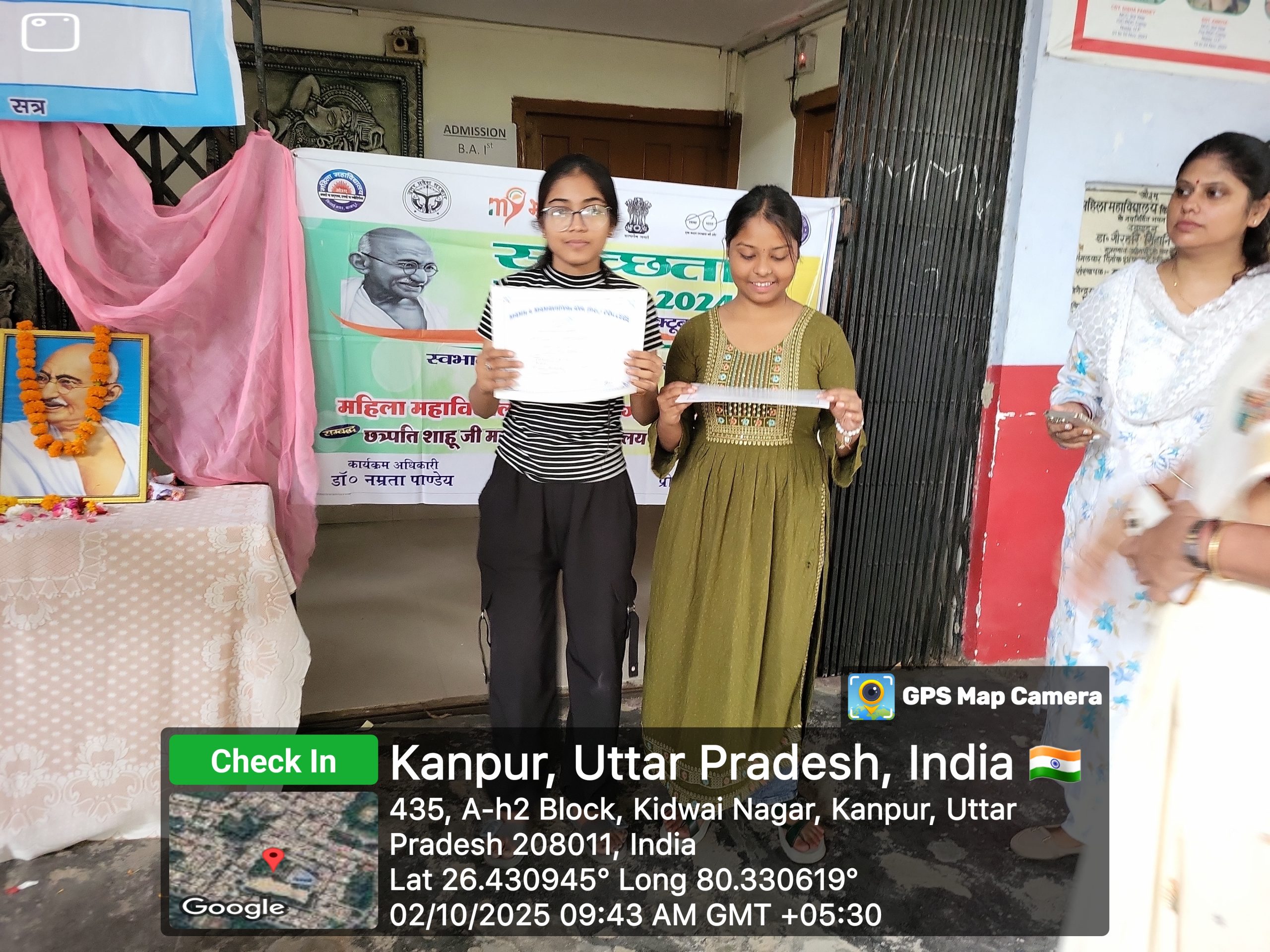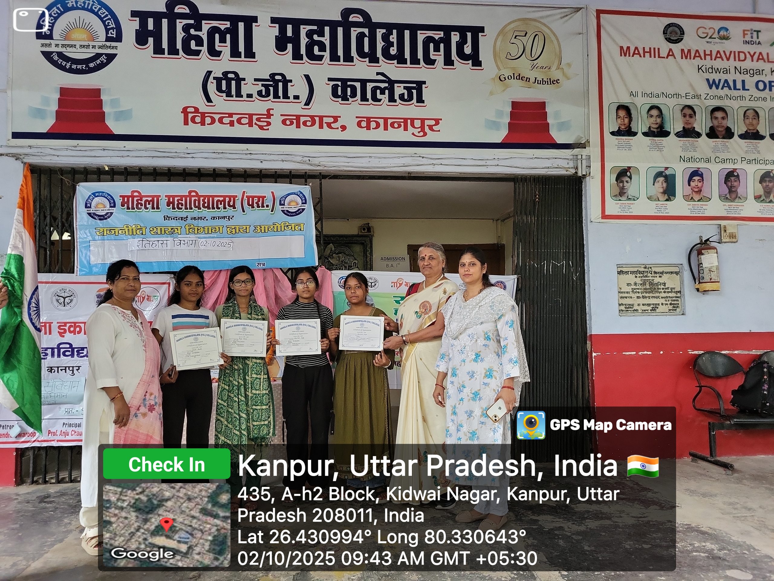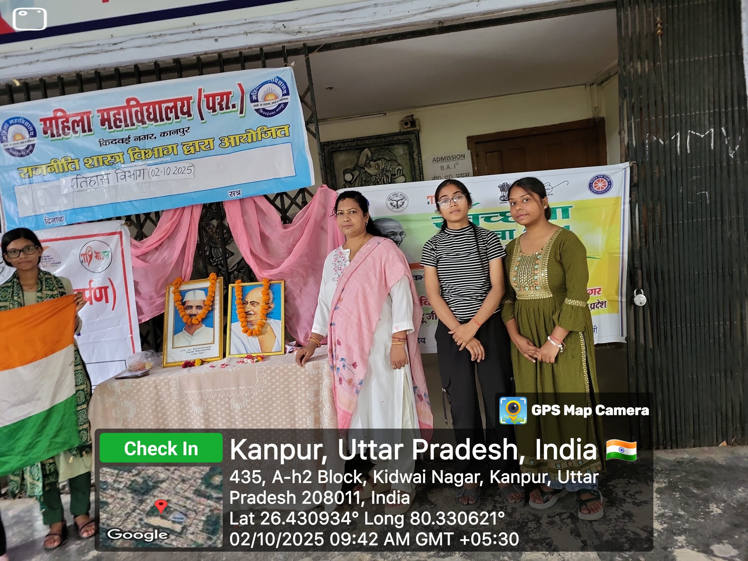 उत्तर प्रदेश शासन के निर्देशानुसार स्वतंत्रता के अमृत काल में राष्ट्रपिता महात्मा गांधी जी की जयंती एक उत्सव के रूप में मनायी जा रही है जिसके अंतर्गत “हमारा संविधान हमारा स्वाभिमान “ टैग लाइन के अंतर्गत महिला महाविद्यालय, किदवई नगर , कानपुर के राष्ट्रीय सेवा योजना इकाई समर्पण के द्वारा द्वारा छात्राओं के मध्य “महात्मा गांधी की विचारधारा: आदर्शवाद या यथार्थवाद” विषय पर वाद - विवाद प्रतियोगिता का आयोजन दिनांक २ अक्टूबर २०२५ को प्रातः ९ बजे महाविद्यालय परिसर में किया गया ।कार्यक्रम का शुभारंभ कार्यवाहक प्राचार्या प्रोफ़े. ममता गंगवार जी के द्वारा राष्ट्रपिता महात्मा गांधी एव श्री लाल बहादुर शास्त्री जी के छाया चित्रों पर माल्यार्पण एव पुष्पांजलि अर्पित करके किया गया । छात्राओं को आशीर्वचन प्रदान करते हुए ममता गंगवार मैम ने कहा “गांधी जी और शास्त्री जी इस बात का प्रतीक हैं कि विचारों की ताक़त और कर्म की निष्ठा से राष्ट्र और जीवन दोनों को बदला जा सकता है”। राजनीति शास्त्र की विभागाध्यक्षा डॉ अनामिका वर्मा ने अपने संबोधन में कहा कि “गांधी जी का सत्याग्रह और शास्त्री जी का ‘जय जवान, जय किसान’ मिलकर हमें यह प्रेरणा देते हैं कि हर छात्र समाज और राष्ट्र निर्माण की ताक़त बन सकता है।” एनएसएस यूनिट की प्रभारी डॉ नम्रता पांडे ने अपने संबोधन में कहा कि गांधी जी के आदर्शों से हम सभी को प्रेरणा लेनी चाहिए जिससे हम एक प्रगति शील समाज का निर्माण कर सकें ।श्री प्रमिल दुबे , छोटे लाल , रामचंद्र एव समूर्ण महाविद्यालय का कार्यक्रम को सफल बनाने में सक्रिय योगदान रहा ।
