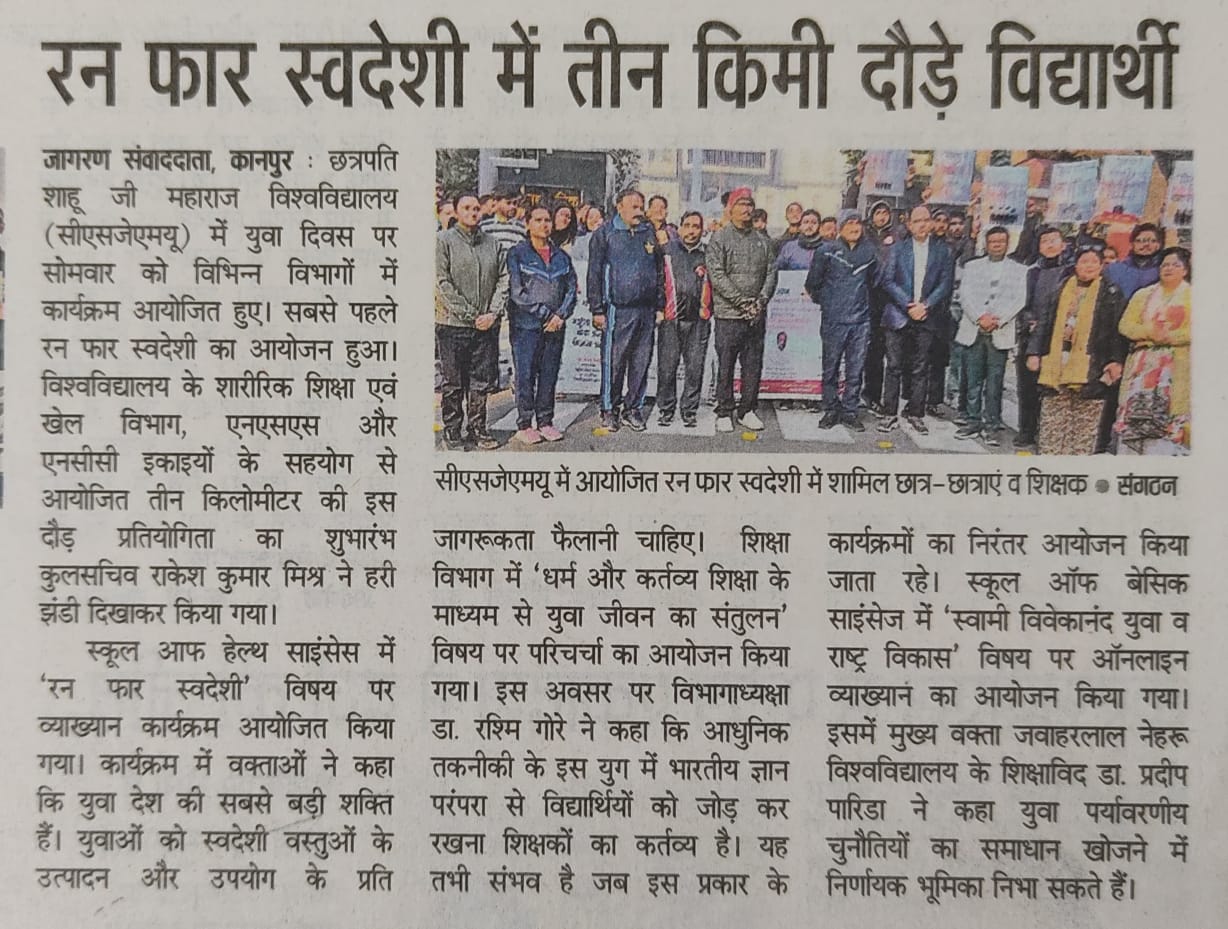 स्वदेशी प्रोडक्ट्स के इस्तेमाल और लोकल इंडस्ट्रीज़ को सपोर्ट करने की अहमियत को बढ़ावा देने के लिए स्वदेशी के लिए एक रन सक्सेसफुली ऑर्गनाइज़ किया गया। इस इवेंट में जोश के साथ हिस्सा लिया गया, जिससे आत्मनिर्भरता और देश के गौरव के बारे में अवेयरनेस फैली। पार्टिसिपेंट्स ने रन में एक्टिवली हिस्सा लिया और लोगों तक स्वदेशी का मैसेज पहुंचाया।